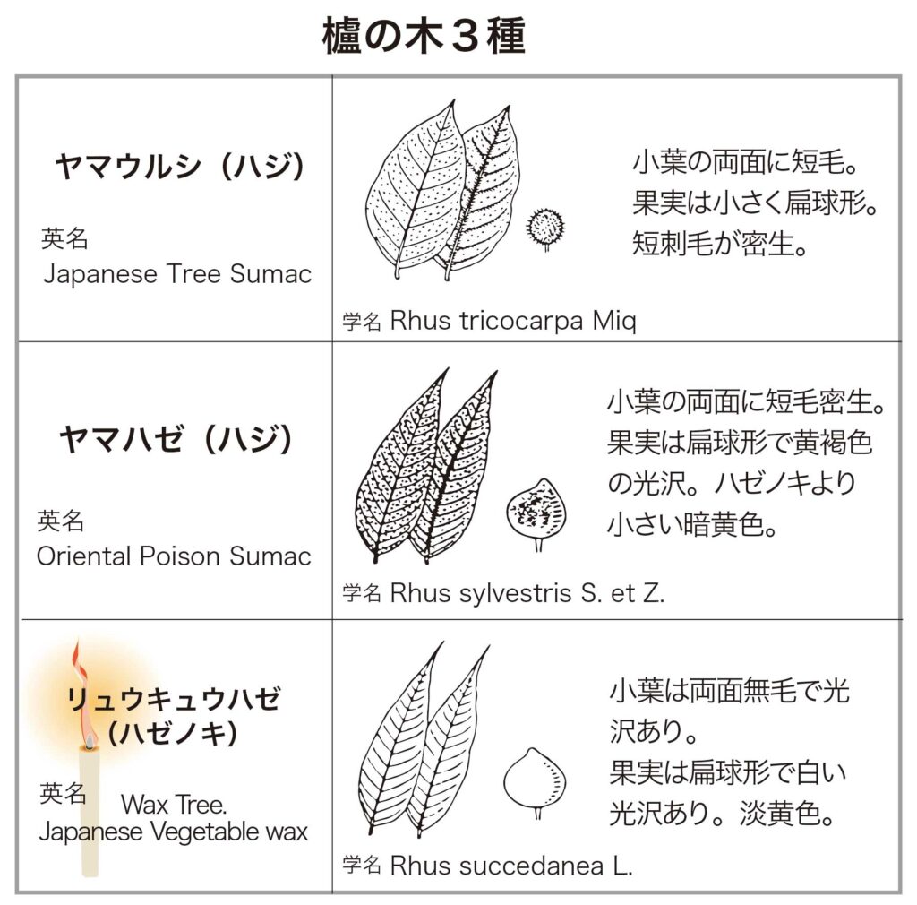 ヤマウルシ、ヤマハゼは山で自生しているもので、日本で産業として栽培されてきた歴史があるのはリュウキュウハゼ(ハゼノキ)です。